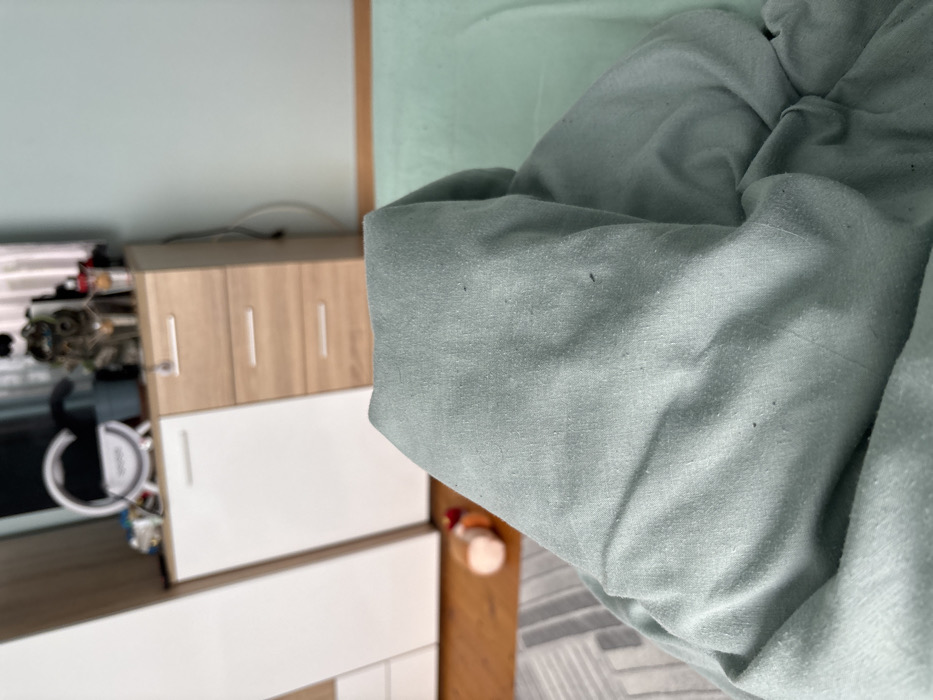 The scene depicts an interior residential space in Nadarevo, Bulgaria. In the immediate foreground, a substantial amount of crumpled, light green fabric, identified as a blanket or duvet, dominates the lower half of the frame, showing small dark particulate matter on its surface. The fabric extends upwards, suggesting it covers an unseen subject or object. To the left, a section of light wooden flooring is visible, partially covered by a grey and white geometric patterned rug. An upright white and light wooden cabinet or wardrobe unit is positioned against a light blue-green wall. The unit consists of a taller white section on the left and a shorter light wood section with three drawers on the right. On top of the wood section, a white circular ring light stands beside a multi-colored figurine, possibly a cat, and other indistinct objects, including a small red and white container. A light brown cylindrical object with a red top, possibly a bottle, rests horizontally on the wooden floor to the left of the blanket. No individuals are visible.