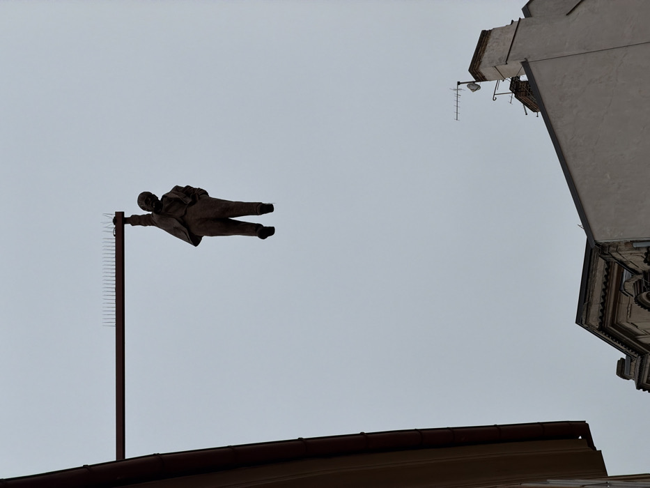 - "The image displays a bronze sculpture of a man hanging by his right hand from a horizontal metal beam, positioned against an overcast, light grey sky" by FM-7gWCF3, licensed under CC BY 4.0