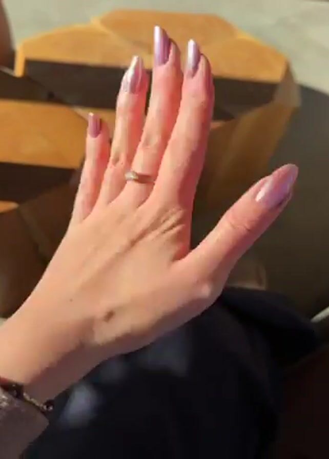 The video displays a woman's hand adorned with long, mauve-colored nails and a gold ring with a rectangular stone