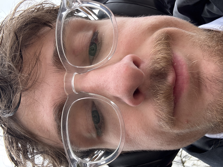 A close-up, low-angle frontal portrait depicts a Caucasian male. The subject wears clear, thick-framed eyeglasses, through which his downcast green-hued eyes are visible. He has wavy brown hair, a prominent nose, and a light brown mustache with stubble around his mouth. Black over-ear headphones are present on both sides of his head. A dark jacket collar is visible over a white shirt collar below his chin. The background is an indistinct, light-toned outdoor environment with minimal detail, possibly indicating foliage on the left periphery. The scene is located in Vincennes, France.