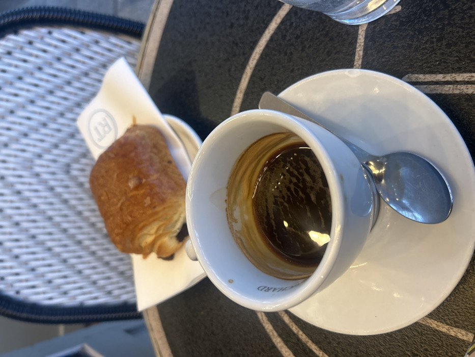 A close-up, eye-level shot captures a breakfast or coffee break scene at an outdoor cafe. In the foreground, a white ceramic espresso cup, bearing the brand "RICHARD" vertically on its side, sits on a matching saucer. The cup contains dark espresso, approximately half-full, with a visible crema layer and reflections on its surface. A small silver spoon rests on the saucer to the right of the cup. To the right of the espresso, the rim of a clear glass, likely containing water, is partially visible. In the mid-ground, positioned slightly behind and to the left of the espresso cup, a golden-brown pain au chocolat rests on a small white plate. The pastry is flaky and appears freshly baked. Beneath the pastry and plate is a white paper napkin, subtly folded, displaying a circular logo with the interlocking letters "RT" in light gray. The objects are arranged on a dark-colored, round table with subtle lighter-colored concentric or linear patterns. In the background, a portion of a chair with a characteristic white and dark woven rattan pattern is visible, typical of Parisian cafe seating. The overall setting is consistent with an outdoor cafe in Paris, France, given the characteristic items and styling, including the "RICHARD" coffee brand, prevalent in the region. No individuals are depicted, but the items suggest recent use or preparation for a customer.