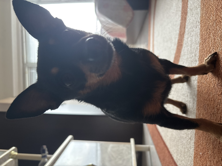 - "An indoor scene in Kavarna, Bulgaria, depicts a small, short-haired, black and tan dog standing on a striped carpet" by FM-96VLv2, licensed under CC BY 4.0