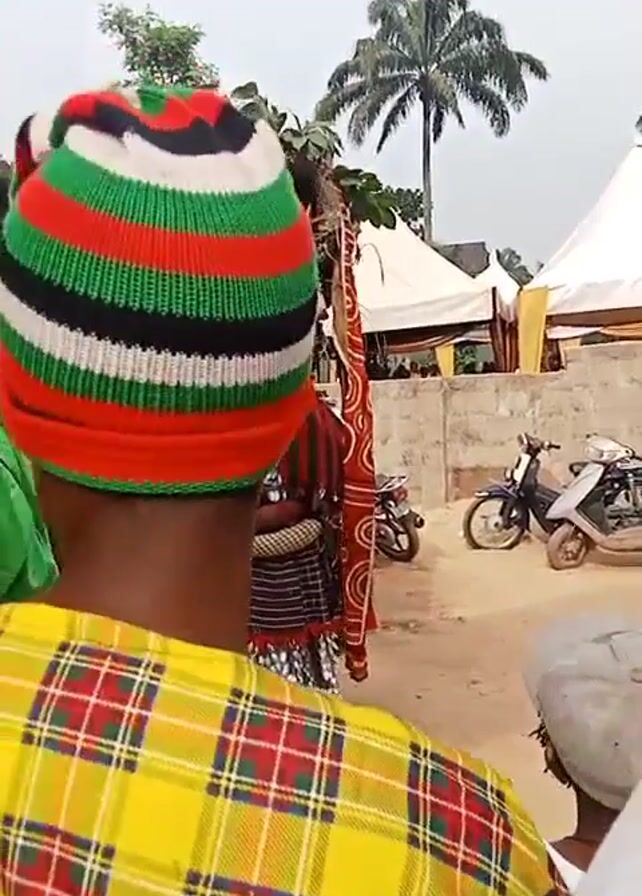costumed figure participating in a cultural performance. The figure is dressed in a black and white patterned outfit with a red and black striped garment over it. They also have a large structure on their head adorned with figures, plants, and other decorative elements. Several people are observing and recording the performance with their phones. The setting appears to be an outdoor event with tents, palm trees, and motorbikes visible in the background. Some of the observers are wearing traditional Nigerian attire.