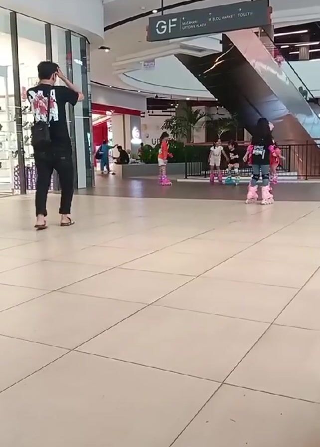 The video appears to be shot from a mobile phone while walking through a shopping mall. Initially, several children are seen rollerblading in the mall's open area. As the camera moves, the focus shifts to a storefront with the word "Swatch" displayed prominently in large pink letters. Several people are seen sitting near the store's entrance. The video is slightly shaky, indicating that the person holding the phone is walking.