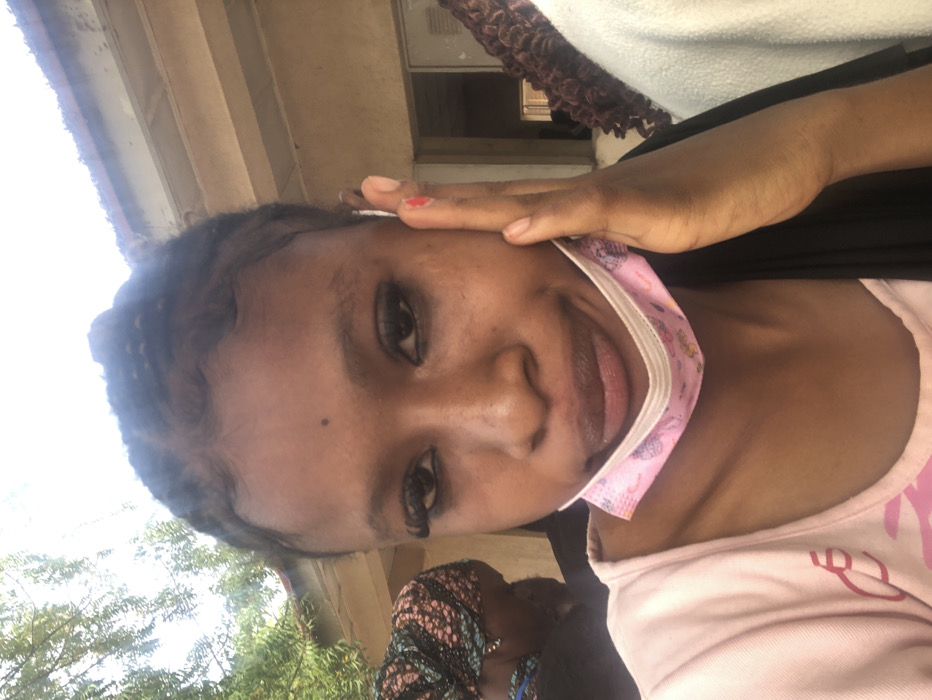 A young Black female is depicted in a close-up portrait, looking directly at the camera. She has braided hair with styled baby hairs along the forehead and dark eye makeup. A light pink disposable face mask with a subtle pattern is pulled down to rest below her chin. Her right hand, with red nail polish on at least one fingernail, is positioned against her right cheek. She is wearing a light pink top. To the left, the head and shoulder of another individual wearing a multi-patterned headscarf are partially visible. To the right, a portion of a third person wearing a light-colored garment is seen. The background features bright daylight, green foliage on the left, and a light-colored building with a dark roofline on the right. This scene is located in the city of Dutsinma B, Nigeria.