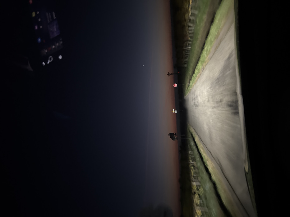 The image displays a paved rural road in Epfig, France, observed from inside a vehicle during twilight hours. The sky transitions from dark blue overhead to an orange-red gradient at the horizon. A single bright celestial body is visible in the upper sky, along with a faint, linear contrail. Vehicle headlights illuminate the asphalt road surface, which extends forward into the distance, appearing slightly reflective. The road is bordered by grass shoulders on both sides, beyond which are fields or vineyards marked by fence posts. On the left side of the road, two signs are visible on poles: one dark, rectangular object, possibly a solar panel or sensor, and further down, a reflective yellow rectangular sign. On the right side of the road, a red octagonal "STOP" sign is present, followed by a wooden crucifix depicting a figure. No individuals are visible. A reflection of a vehicle's digital display screen, showing various icons, is partially visible in the upper right corner of the image.