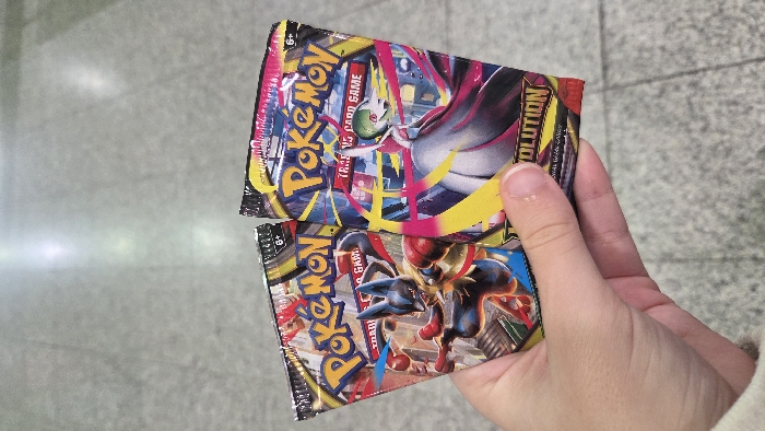 - "A fair-skinned hand holds two sealed Pokémon Trading Card Game booster packs" by FM-eQMAb2, licensed under CC BY 4.0