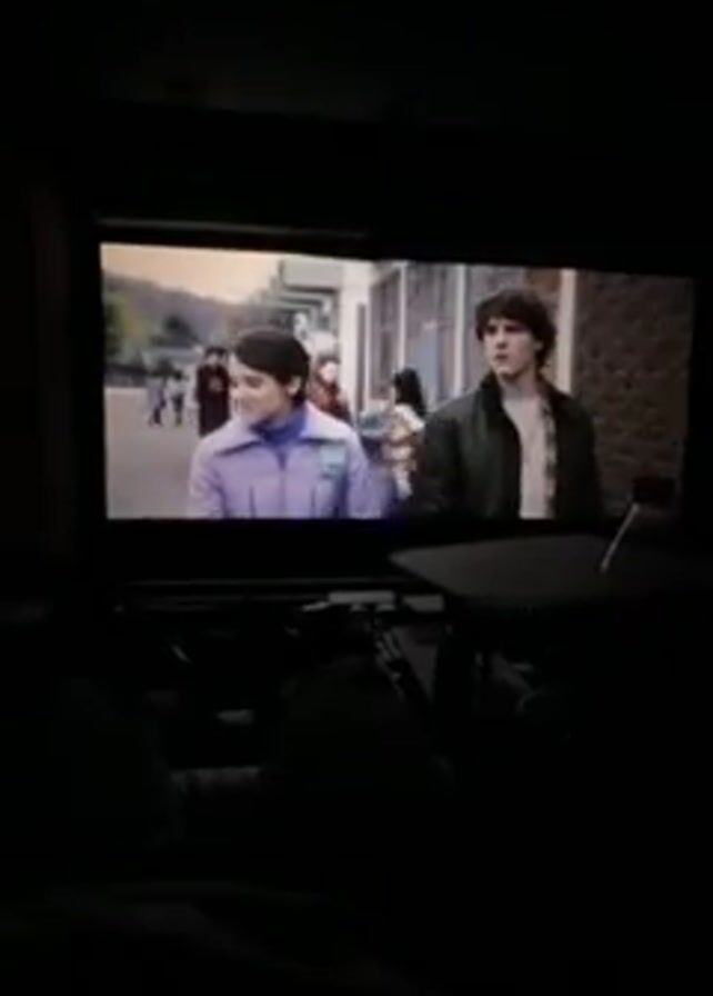 person watching a movie projected onto a screen in a dark room. The movie scene features two young people walking down a street, with other people in the background. The woman wears a purple jacket and the man wears a green jacket. Subtitles in Spanish are visible at the bottom of the screen. The viewer is sitting in a car-like seat with a small table in front of them. A bottle is also placed on the table. The overall environment suggests a personal movie theater or a private viewing space.