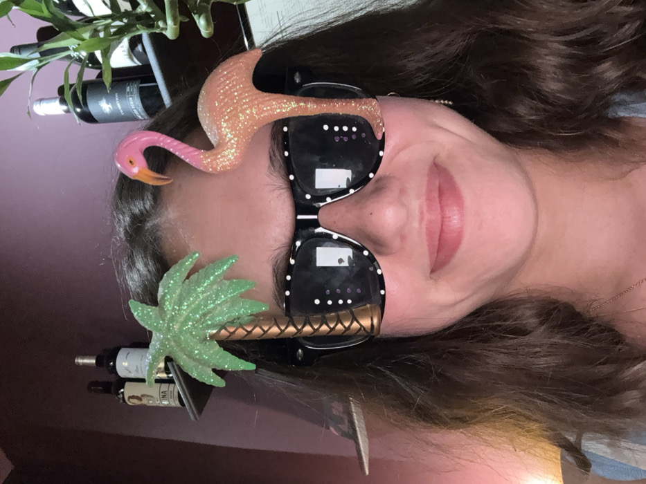An individual, identifiable as female, is depicted from the mid-chest upwards, smiling directly towards the viewer. She has long, dark brown, wavy hair. She is wearing oversized, black-framed novelty sunglasses adorned with small white polka dots; the lenses reflect multiple small purple and white light points. Attached to her head are two glitter-covered novelty decorations: a green palm tree positioned above her left eyebrow and a pink flamingo above her right. She wears a thin chain necklace with a small pendant. The background consists of a dark purple wall. On the left side of the frame, a narrow dark shelf is mounted, holding two wine bottles; the label of the left bottle partially reads "VILLA MARINA." On the right side, another dark shelf supports a third wine bottle with a black label clearly indicating "DOMAINE BOYAR - VINTAGE RESERVE," partially obscured by a potted green plant resembling lucky bamboo. The presence of identifiable Bulgarian wine brands, "Villa Marina" and "Domaine Boyar," places this indoor scene within Sofia, Bulgaria, likely in a residential or commercial establishment.