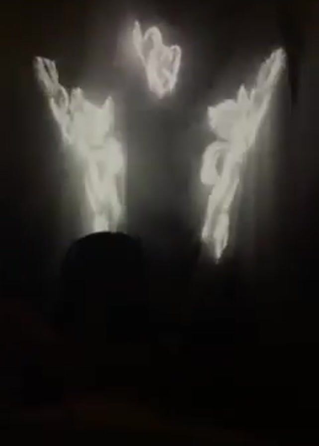 dark room with three bright, ghostly figures projected on the wall. They appear to be of people with their arms raised. A person is visible in silhouette in the foreground, seated in front of the projection.