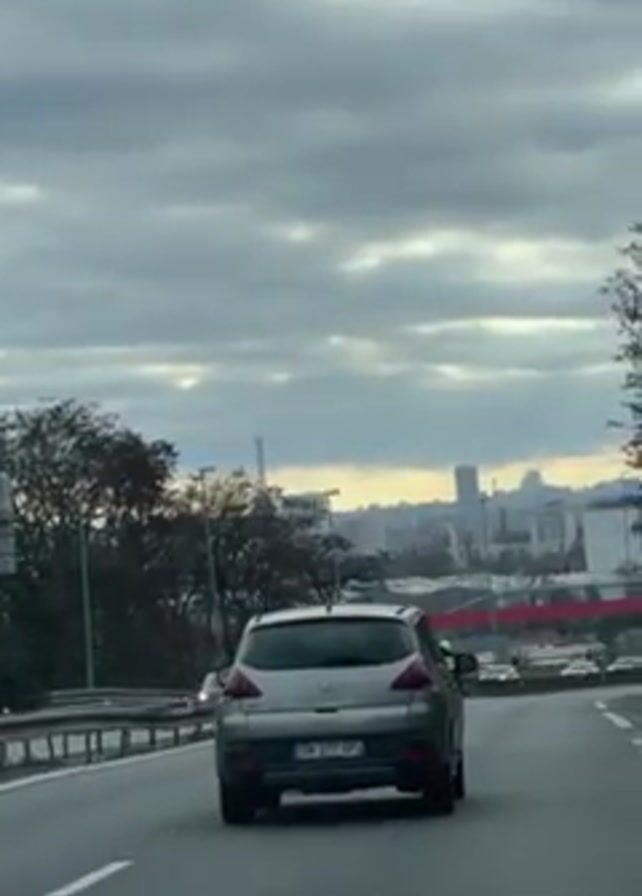 A car travels on a highway under a cloudy sky, with the Eiffel Tower visible in the distance. The highway has multiple lanes and the car is in the right lane. Other vehicles, including a truck, a white car, and a motorcycle, are also on the highway. The surrounding landscape includes trees and city buildings. The sky is overcast with grey clouds.