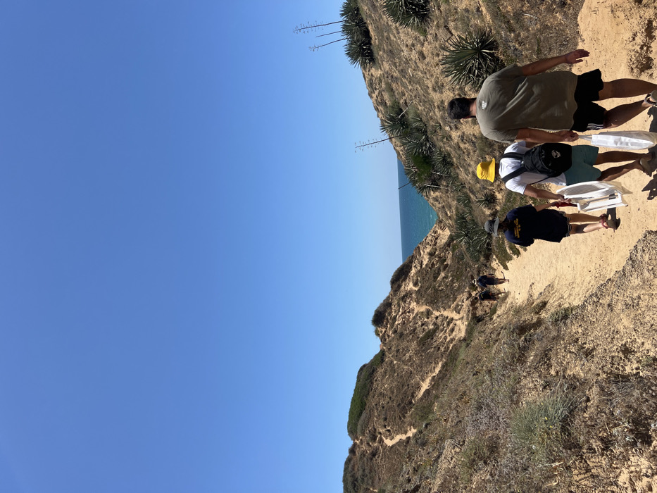 four people walking down a dirt path, surrounded by hills and sparse vegetation. They are walking towards the blue ocean, visible in the distance between the two hills. The group is in the southern coastal plain region, near the town of Ga'ash, Israel, situated at coordinates 32.226, 34.819. The sky is blue with no clouds, indicating a sunny day. The four people are walking in single file, with the person at the back carrying a white bag. The second person from the back is wearing a yellow hat and carrying a white bag. The person in front is wearing a blue shirt with a yellow design. The vegetation is sparse and dry. The dirt path is relatively narrow and dusty. The scene is a calm and peaceful one, with the people appearing to be on a leisurely stroll. The environment is arid and rocky, with the hills offering a natural barrier between the people and the sea.