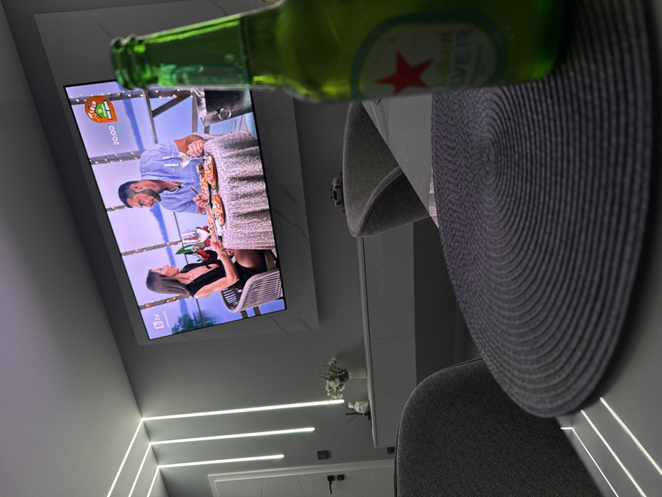 The image depicts an interior scene within a modern room located in Zhiten, Bulgaria. In the immediate foreground, a green glass bottle, identified as Heineken Silver by its label featuring a red star, stands on a dark gray circular woven placemat. Both are positioned on a reflective white table. A dark gray upholstered chair is visible on the left side of the midground, with additional chairs partially observable. The primary focal point in the background is a large, wall-mounted flat-screen television displaying what appears to be a scene from a television program. On the screen, a man and a woman are seated opposite each other at a small, round table covered with a shimmering, light-colored cloth. They are engaged in conversation, with plates of food and wine glasses on the table, and a silver ice bucket situated to the man's right. The background of the TV scene shows a body of water. On-screen graphics include "bTV," "ПРЕМИЕРА," "МОЯТ ДОМ" (with a house icon), and the time "20:00." The television is set within a white wall panel accented with gray marble-like veining. Below the television, a long, white, minimalist console or cabinet is mounted. On its surface, a small white vase holding white flowers and a decorative white object are visible. The far left wall features multiple vertical recessed LED light strips, emitting a cool white glow. A white door with a dark handle is visible on the extreme left. The room's aesthetic is contemporary, dominated by white and gray tones, with integrated lighting contributing to the illumination. The image is captured from a low angle.