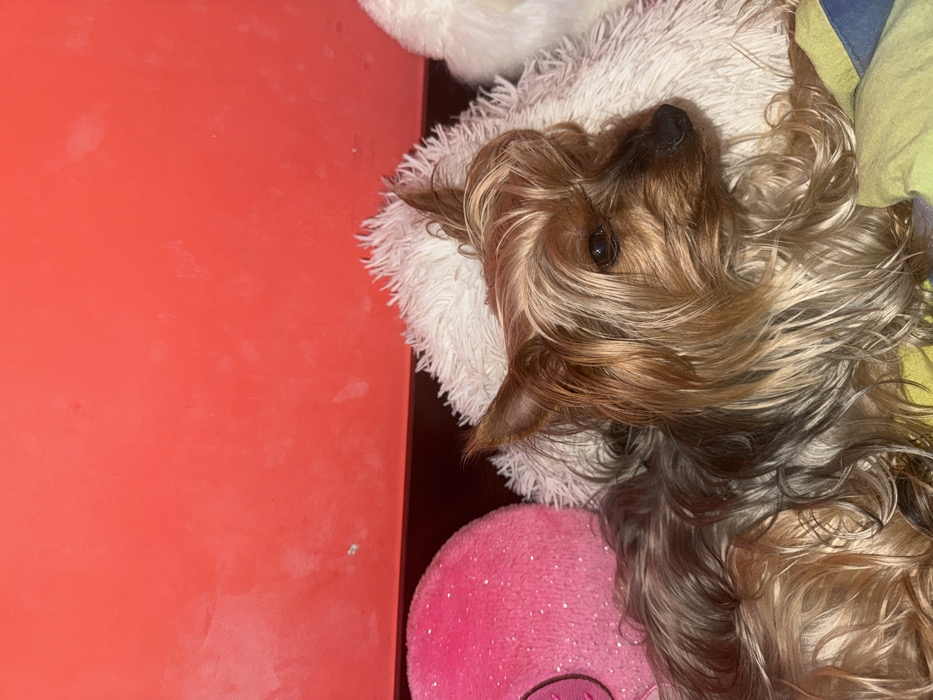 - "A Yorkshire Terrier, or similar long-haired terrier breed, is depicted lying down on a white, shaggy cushion within an indoor setting in Cherven Bryag, Bulgaria" by FM-uodRx2, licensed under CC BY 4.0