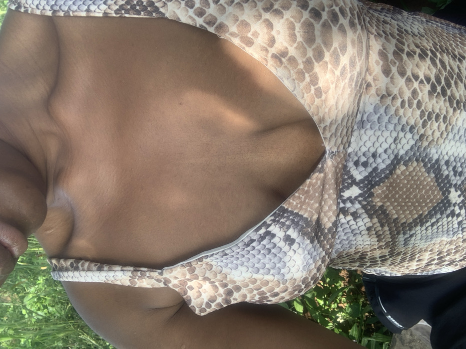 The image captures a close-up of an individual's upper torso and partial face, identified as being in Gidan Jatau, Nigeria. The subject exhibits a dark skin tone, with the chin and lips partially visible at the top edge of the frame. The individual is wearing a v-neck garment with thin shoulder straps, patterned with a design resembling snakeskin, featuring shades of brown, beige, and dark gray. The upper chest, shoulders, and cleavage are exposed. Sunlight casts distinct highlights and shadows across the skin and clothing. The background, largely out of focus, consists of green foliage, indicative of an outdoor, vegetated environment. A fragment of dark-colored fabric is visible at the bottom left, underneath the patterned garment. No specific actions or interactions are discernible.