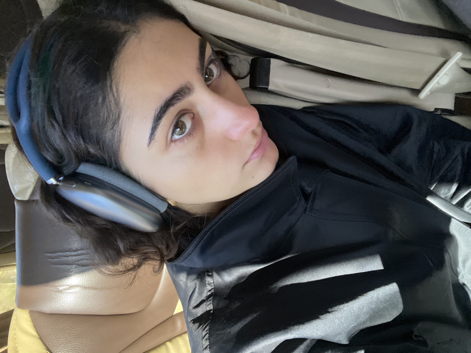 This image is set in an interior location within the city of Aveiro, Portugal. The scene features a young woman with dark, curly hair and brown eyes, looking directly at the camera with a neutral to slightly somber expression. She wears large, over-ear headphones with silver-grey earcups and a dark blue headband. Her attire consists of a black, collared garment with a slight sheen, possibly a jacket or shirt. A small, gold-colored stud earring is visible on her right earlobe. The woman is seated, with a light brown, possibly leather, upholstered seat visible behind her to the left, showing some creases. To her right, a lighter-colored, possibly beige or light grey, upholstered seat with vertical paneling is partially visible. The lighting is indirect, casting subtle shadows and highlighting the texture of her clothing.