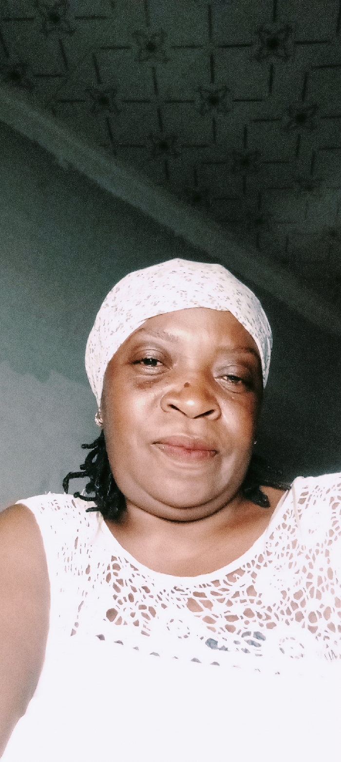 A woman wearing a white headscarf and lace-patterned top looks directly at the camera. Her skin tone is brown. She has dark hair visible near her ears. Above her is a dark ceiling with a geometric pattern. The background behind her is a muted grayish color. The lighting is soft and slightly diffused, creating a close and personal portrait.