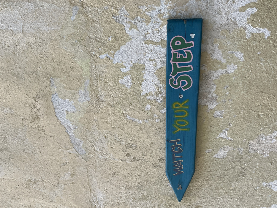 A wooden sign hangs on a textured wall with peeling paint. The sign is painted teal and reads "WATCH YOUR STEP" vertically in colorful lettering. "STEP" is in green with a pink outline, while "YOUR" is yellow and "WATCH" is white. A small heart detail is visible. The wall's texture is rough with beige and white patches, indicating layers of paint and age.