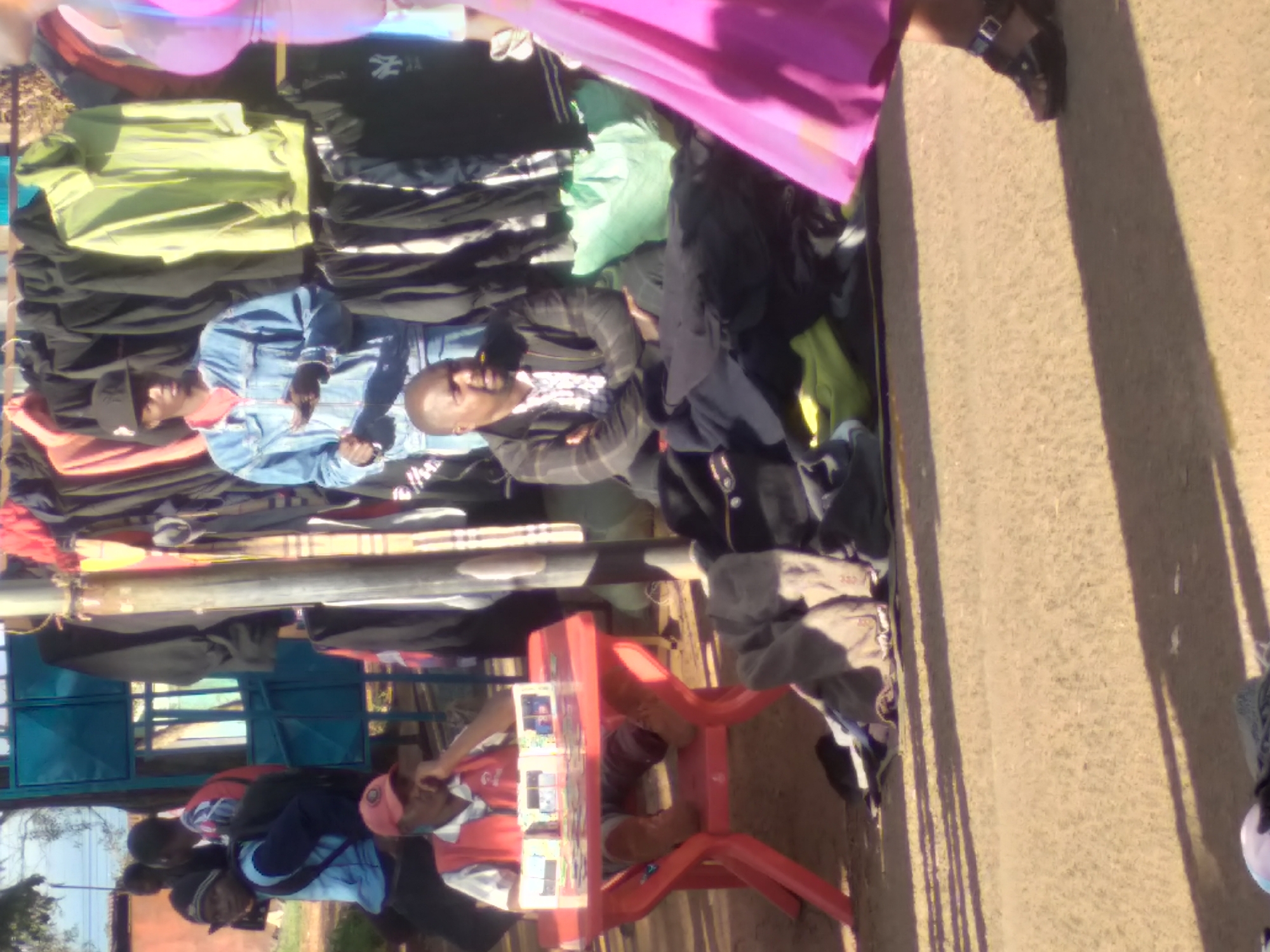 The image depicts an outdoor clothing market in Nyeri, Kenya