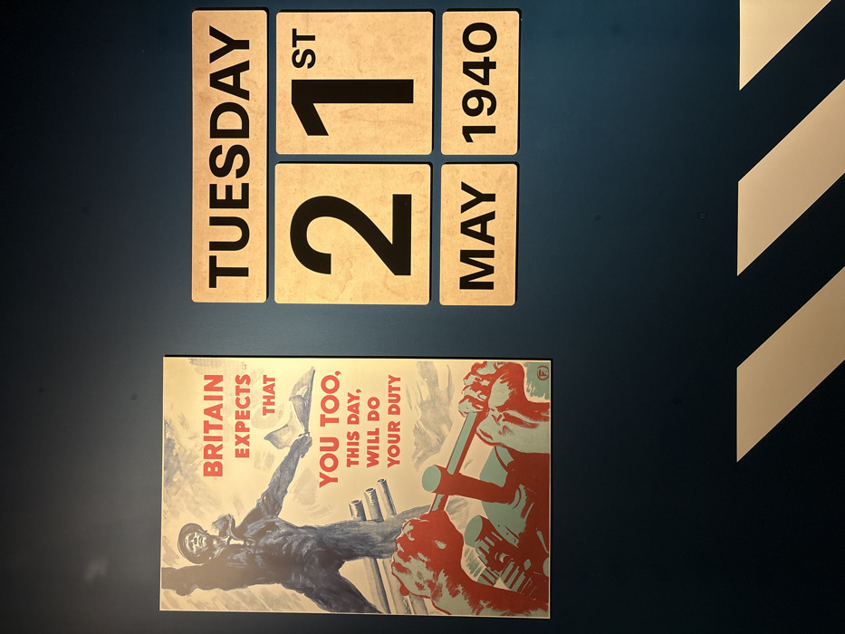 The image displays an indoor wall exhibit within a historical museum or exhibition in the city of Gibraltar, Gibraltar. A rectangular British wartime propaganda poster is mounted on the left side of a dark blue wall. The poster depicts a male figure, possibly a sailor or soldier, in uniform with one arm raised. Below this figure, a pair of hands operates machinery, possibly a gun turret, with gun barrels visible in the background. The text on the poster reads: "BRITAIN EXPECTS THAT YOU TOO, THIS DAY, WILL DO YOUR DUTY." The poster utilizes blue, white, and red/pink color tones. To the right of the poster, a five-panel display is affixed to the same dark blue wall, indicating a specific historical date. These tan-colored panels with black lettering spell out "TUESDAY" on the top panel, "21ST" across the two middle panels, and "MAY 1940" across the two bottom panels. The lower section of the dark blue wall features a pattern of diagonal white stripes. The entire scene is uniformly lit, characteristic of an indoor display environment.