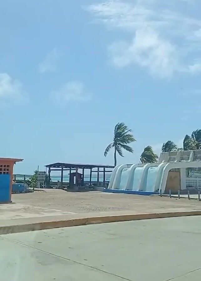 From a vehicle moving along a road next to a beachside area, the camera captures a tranquil, mostly empty scene. There's a blue building with orange accents next to a small shelter structure. Nearby is a larger, white, tunnel-like structure by the beach with blue accents. Several palm trees are whipping in the wind on the side of the road and across the way next to the beach. The day is sunny with a few white clouds in the blue sky, and birds are visible flying overhead. The only visible action is the camera's movement down the road and the trees blowing in the wind.