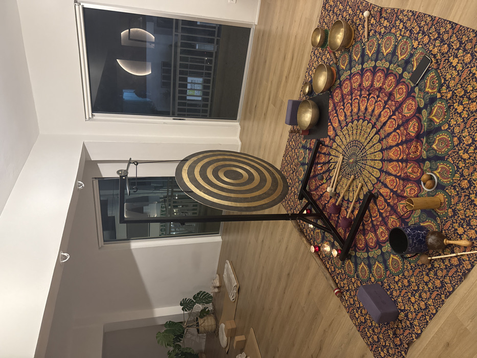 A sound healing setup is displayed on a wood floor