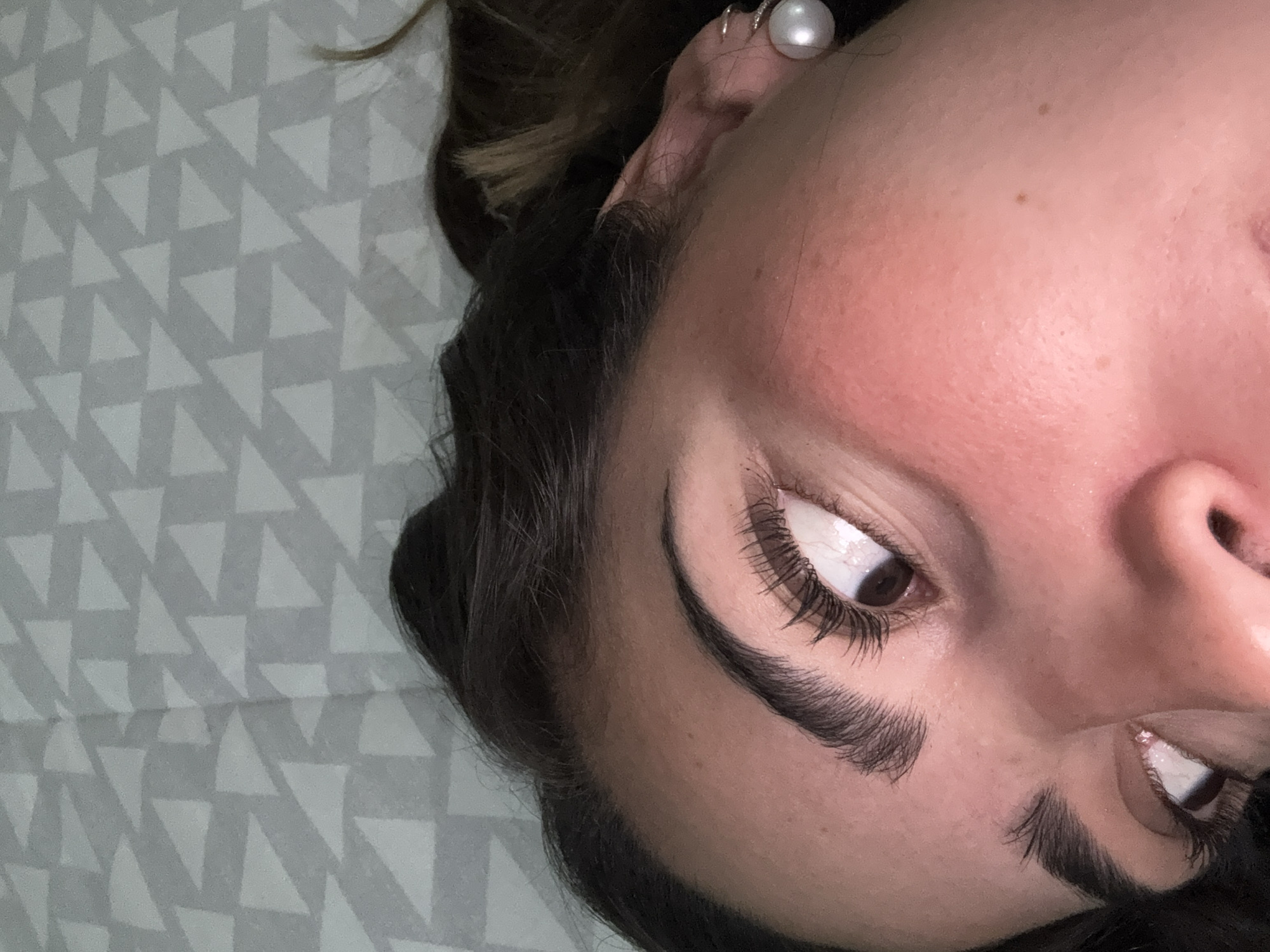The image presents a close-up, upward-angled view of the upper right portion of a human face, set indoors within Santa Clara Ocoyucan, Mexico. The individual is in a supine position, resting on a light grey textile surface patterned with repeating light grey triangles. Visible features include dark brown hair framing the forehead and temple, with a lighter strand noticeable near the right ear. A prominent, dark, well-defined eyebrow arches above a partially open dark brown eye, which exhibits long, curled eyelashes and is directed upwards and to the viewer's left. The sclera of the eye shows minor vascularization. The skin on the cheek and temple area presents a reddish flush, with small hyperpigmented macules visible on the forehead and upper cheek. The top of a nose is partially visible in the lower right quadrant. The individual wears a single, large, spherical white pearl earring on the visible earlobe, accompanied by multiple small, metallic ear cuffs on the upper cartilage of the ear. No other individuals, significant objects, or active interactions are observed. The scene is illuminated by diffuse lighting.