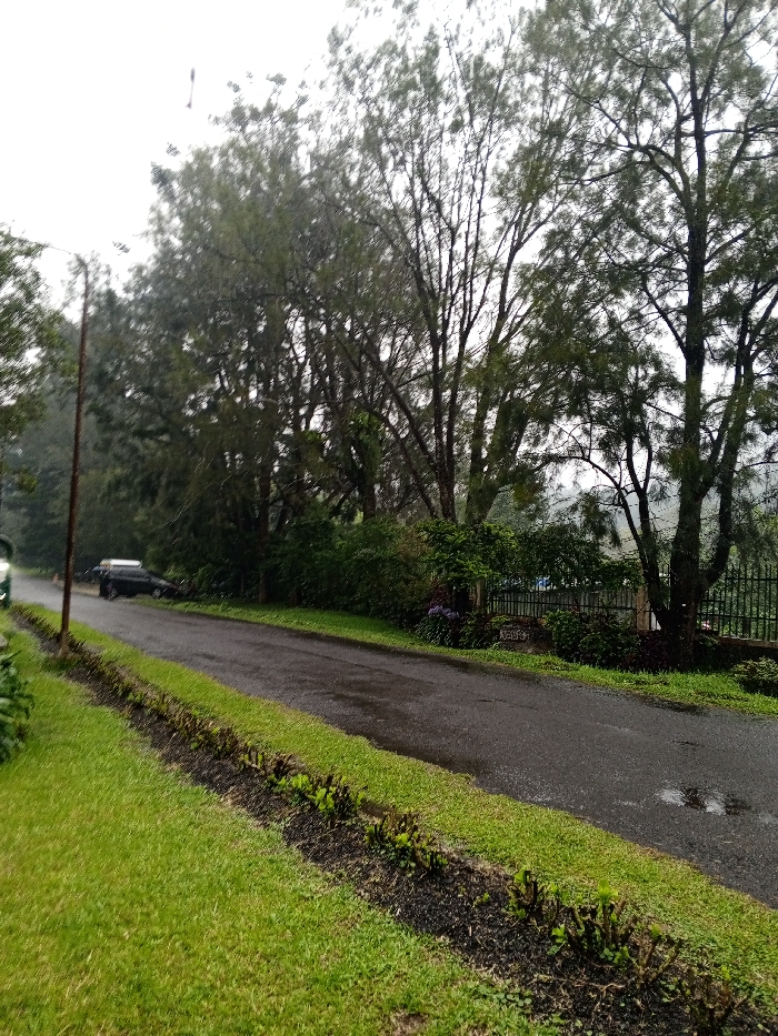 A wet asphalt road curves between green grass and trees. A power pole stands tall on the left. A dark-colored car is parked along the roadside in the distance. A black fence and lush greenery border the road on the right. The sky is overcast, suggesting recent or ongoing rain.