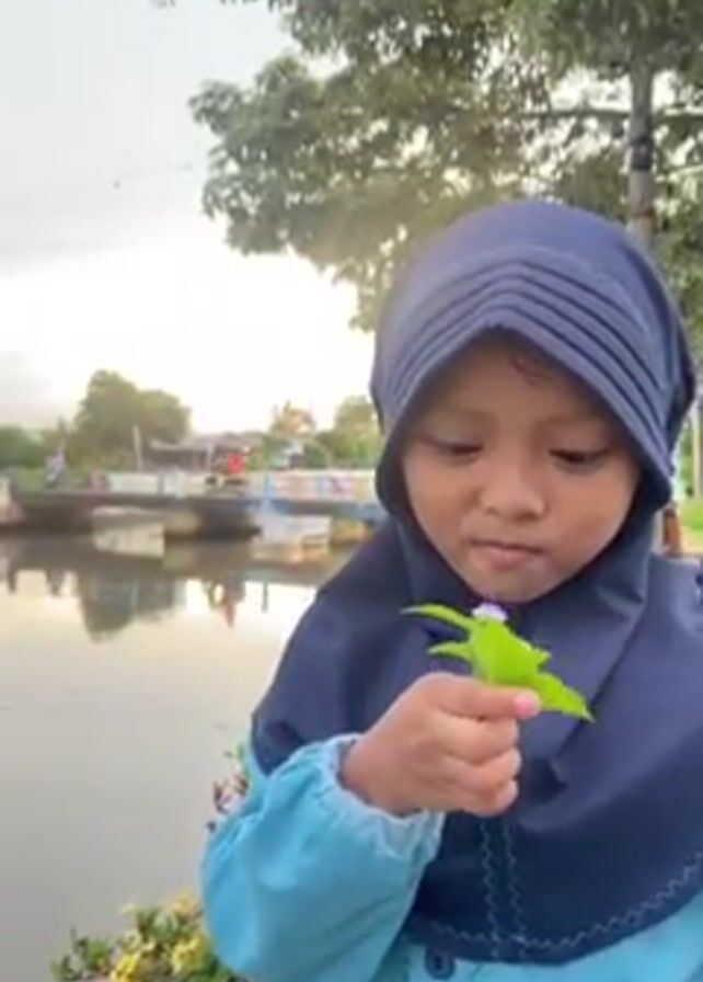 A young girl wearing a blue hijab and light blue outfit is standing near a body of water. She is holding a small green plant with a tiny purple flower and smells it. She wrinkles her nose and says, "Bau banget," which translates to "It smells a lot" or "It stinks". The background shows a bridge and trees, with the sun shining through the branches. The water reflects the sky and surrounding structures.