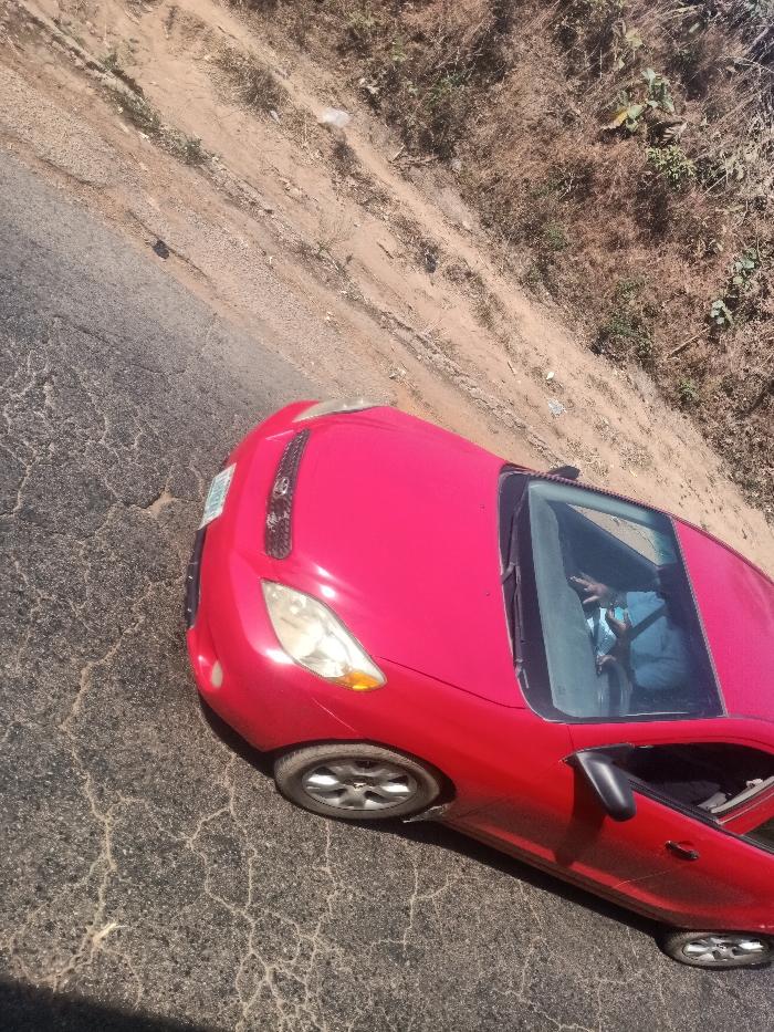 A red compact car, resembling a Toyota Celica, is stationary on the cracked asphalt shoulder of a road. The vehicle displays a Nigerian license plate with "LAG" visible, confirming registration in Lagos, Nigeria. Through the front windshield, the upper torso and hands of one occupant, dressed in a light blue shirt, are discernable within the vehicle's interior. The passenger side door is open. Adjacent to the road is a dry, upward-sloping dirt bank covered with sparse, withered vegetation and scattered small debris. The scene is illuminated by daylight. No other individuals or distinguishing landmarks are present.