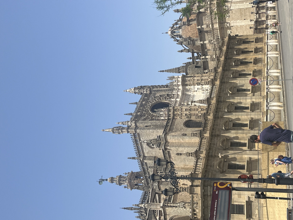 - "A grand, ornate cathedral dominates the scene, displaying intricate stone carvings and spires against a clear blue sky" by FM-l2qUu2, licensed under CC BY 4.0