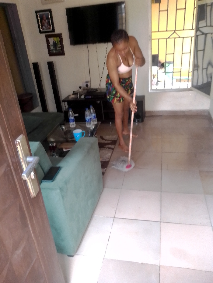 The scene depicts an interior residential space in Ikeja, Nigeria. A female subject, barefoot and dressed in a light-colored bra and multi-colored patterned shorts, is actively mopping a tiled floor with a mop featuring a red head. Her braided hair is pulled back. To the left, an L-shaped sofa in a light green hue is visible, with a mobile phone resting on its armrest. In front of the sofa, a glass-top coffee table holds three plastic bottles of water and a blue mug. Behind the table, a dark entertainment console supports a wall-mounted flat-screen television. Two framed pictures hang on the wall to the left of the television, and two tall, dark vertical objects, possibly speakers, are positioned near the console. The wall to the right features a window secured with horizontal and vertical bars, through which a yellowish exterior wall is partially visible. The floor consists of light-colored square tiles, and a patterned rug is partially visible under the coffee table. A wooden door with a metallic handle is visible in the foreground on the left.