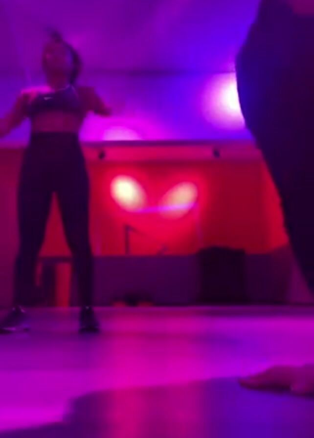A woman in a black sports bra and black leggings is stretching in a room with purple and red lighting. A man walks into the frame wearing a black long-sleeved shirt and grey shorts, and starts stretching his arms. There is a mirror in the background.