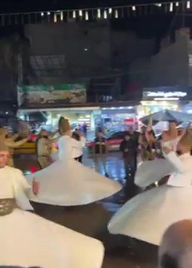 group of men performing a Sufi whirling dance in a public space at night. The dancers are dressed in white robes and tall, conical hats, and they are spinning in circles with their arms outstretched. There are other people standing around watching the performance, including some who are holding flags. The background consists of buildings, shops, and street lights, and it appears to be a Middle Eastern town or city.