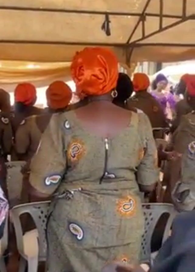Under a covered outdoor space, a group of women are seen from the back. They are wearing similar dresses with a paisley pattern and bright orange headwraps. They appear to be singing or chanting, possibly at a religious or cultural gathering. A few white plastic chairs are visible. The lighting is bright, and the atmosphere seems lively.