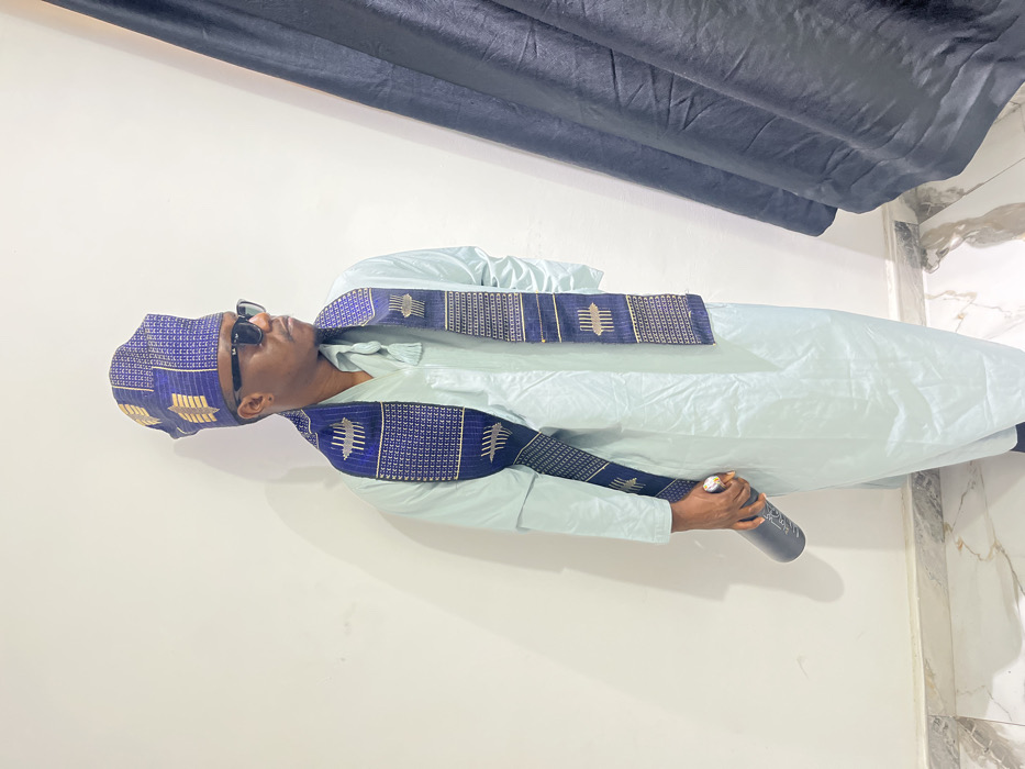 A male individual is depicted standing indoors in Joma, Ghana. He is positioned facing slightly to his right, wearing a light blue, long-sleeved tunic. Around his neck is a dark blue scarf with intricate gold-colored geometric patterns and stylized motifs. A matching dark blue hat with similar gold patterns covers his head. He wears black sunglasses. In his left hand, he holds a dark-colored bottle with a metallic cap, resting against his side. The background consists of a plain white wall on the left and a dark, possibly black, curtain on the right. The floor is tiled with white and grey marble-patterned material, bordered by a grey baseboard.