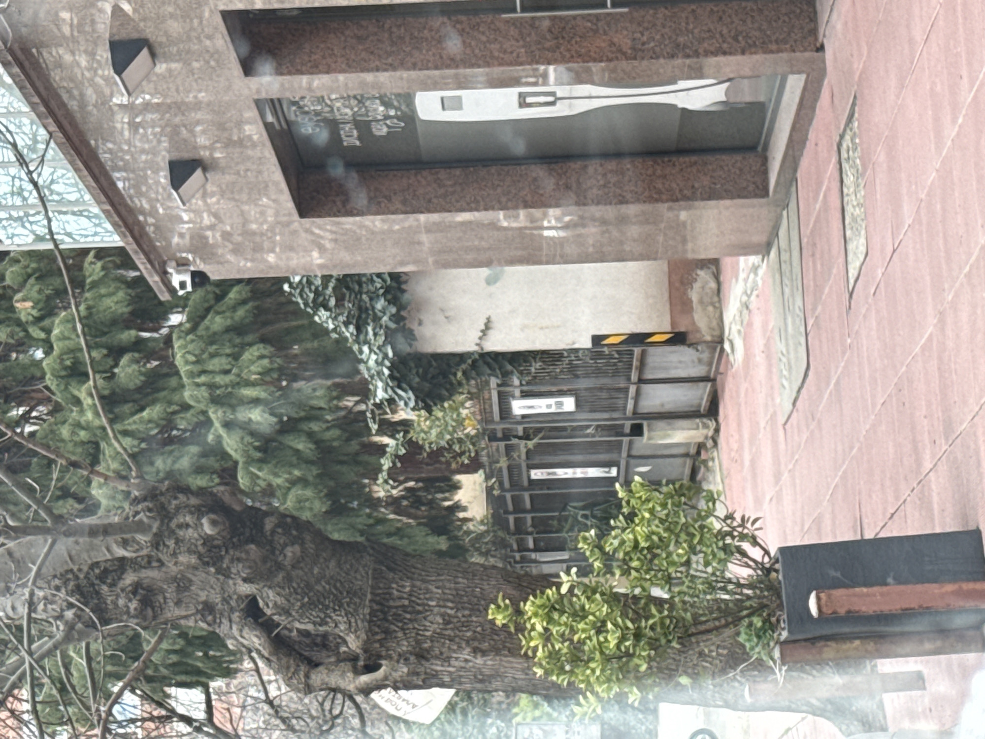The image depicts an urban street scene in Sofia, Bulgaria, characterized by a mix of natural elements and modern architecture. On the left, a large, mature deciduous tree with a thick, gnarled trunk and bare branches stands prominently on a reddish-brown tiled sidewalk. A white rectangular sign with partially visible Cyrillic text ("ПОДН АМАТ") is attached to the tree's trunk. In the immediate foreground, a dark, rectangular planter holds a vibrant green-leafed shrub, flanked by two weathered, rust-colored metal posts. Behind the tree, a dark metal fence or gate with vertical slats is visible, backed by a light-colored wall partially covered with ivy. A post with yellow and black striped caution markings is near the fence. Further back, evergreen trees with dense foliage are present. On the right, a modern building with a polished reddish-brown speckled stone facade features a large glass door or window panel. Mounted above this panel are two angular, dark-colored outdoor light fixtures. A small, black dome-shaped security camera is affixed to the upper left corner of the building's facade. Through the glass, a tall, white, vertical object with a screen and a cable or handle, resembling an electric vehicle charging station or an interactive kiosk, is visible. Partially legible Cyrillic text ("ДИСКОВА АВТОР...") is stenciled or adhered to the glass surface. The ground is uniformly paved with square, reddish-brown tiles. In front of the building entrance, a dark, thin rectangular mat rests on the pavement, and a small square patch of gravel or crushed stone is set into the tiling. No individuals are present or engaged in any activities within the visible scene.
