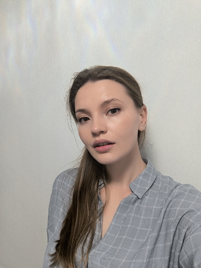 A close-up, chest-up portrait shows a female subject against a plain, light-colored wall. The woman has fair skin, brown eyes, and light brown hair pulled back, with a portion resting over her left shoulder. She wears a light blue or pale grey shirt with a subtle white grid pattern and an open collar. Her mouth is slightly parted. On the upper left background, faint, diffuse, rainbow-like light refractions are visible on the wall surface. The scene is indoors. This image is depicted in the city of Vinnytsia, Ukraine.