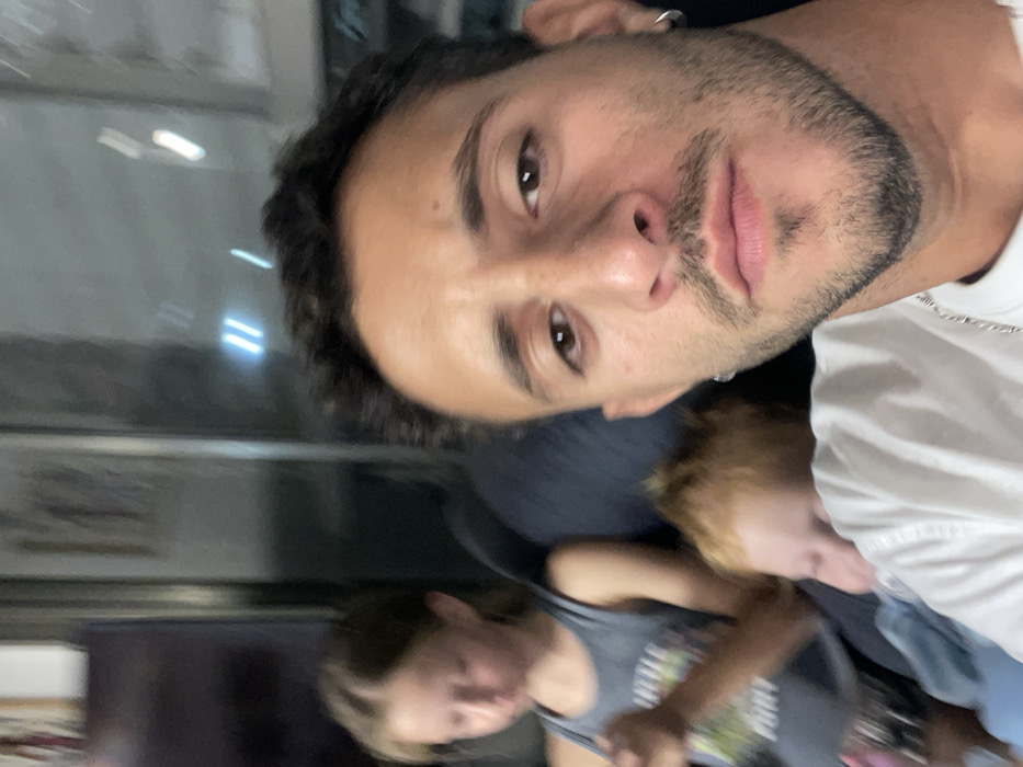 The image is a close-up, selfie-style photograph taken indoors. In the foreground, an adult male with short, dark, curly hair, a trimmed beard, and mustache looks directly at the camera with a neutral expression. He wears a white t-shirt and small silver hoop earrings. Partially visible behind his left shoulder, a young girl, approximately 6-10 years old with light hair, looks downwards, her hands raised as if interacting with an object. Below and to the left of the adult male, a toddler with reddish-blonde hair is visible, appearing to be asleep or resting. All subjects are seated on a dark, upholstered surface, likely a sofa. The background is dark and blurred, containing several bright, linear reflections from an unseen light source, suggesting a reflective surface or window. The location is an indoor domestic setting in the city of Unknown, Unknown.