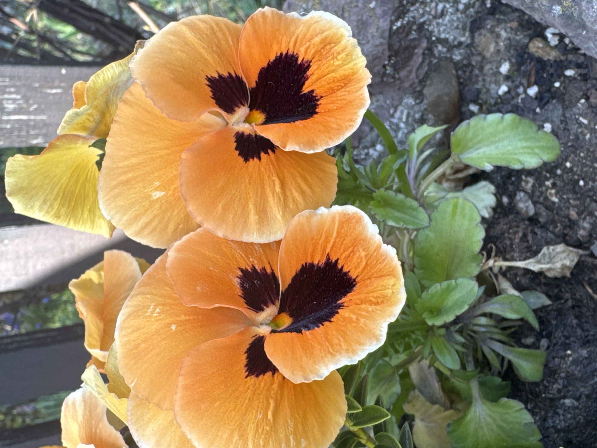 two orange pansy flowers with dark purple centers, growing in a garden bed