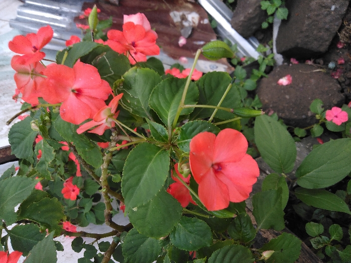 The image captures an outdoor scene in Phou Khoun, Laos, focusing on a vibrant cluster of coral-red Impatiens flowers. Multiple flowers with five petals, some featuring a darker reddish-purple center, are prominently displayed amidst numerous dark green, oval-shaped leaves with serrated edges. Green and brownish stems support the foliage, and several elongated green seed pods are visible, primarily in the lower-right quadrant. The background on the left side reveals a white, textured wall, while weathered, corrugated metal sheeting is partially visible on the right. The foreground consists of dark brown soil, interspersed with small green weeds and several dark grey, irregularly shaped rocks. A few smaller bright pink flowers and scattered pinkish-red specks, likely fallen petals, are present on the ground. No people are depicted; the scene is static.