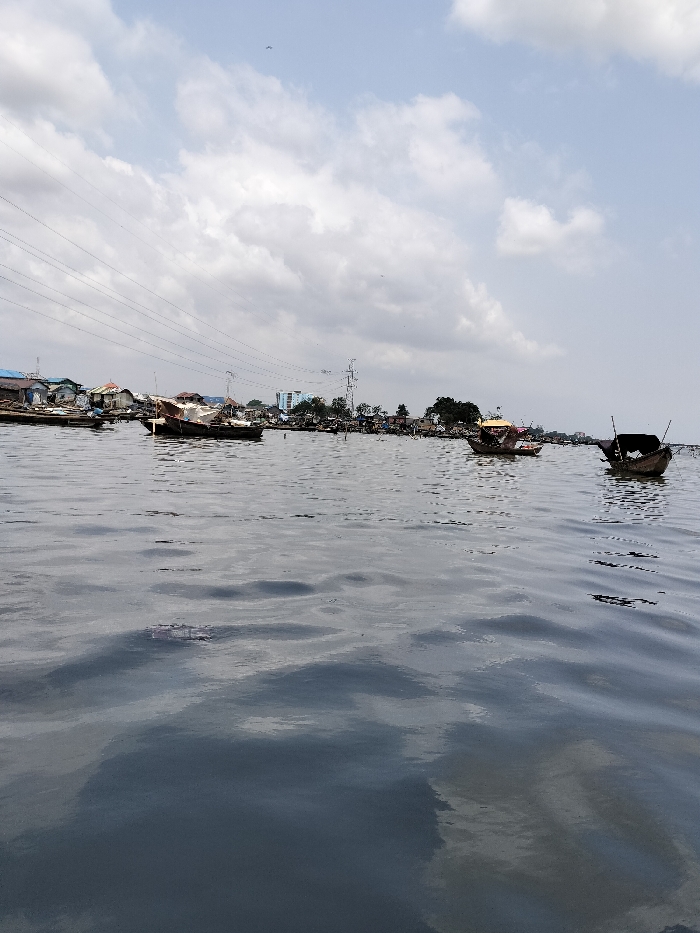 The image depicts a waterfront scene in the city of Iwaya, Nigeria