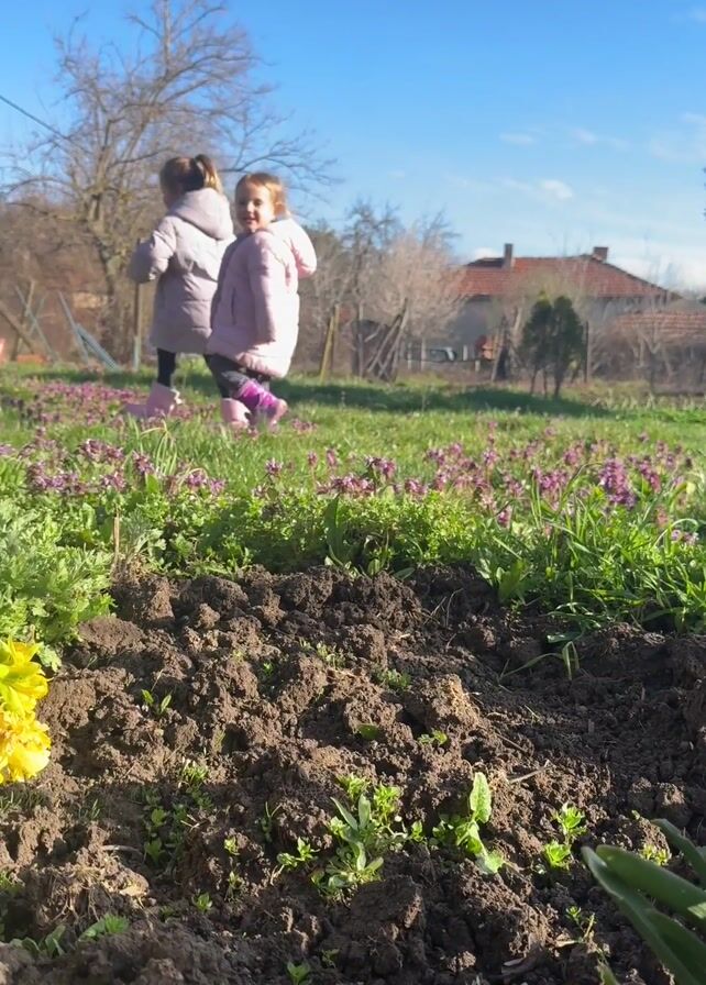 two young children walking through a garden filled with grass and purple flowers. The children are wearing matching pink jackets and purple boots. The foreground features freshly tilled soil with emerging greenery and a cluster of yellow daffodils. In the background, there are houses, trees, and a clear blue sky. The camera is positioned low to the ground, providing a close-up view of the garden floor.