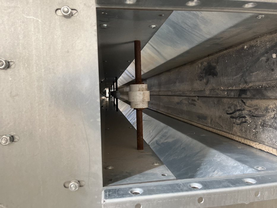 This image displays the internal view of a material handling conveyor or auger system, located in Popovo, Bulgaria. The perspective is directed down a long, narrow, U-shaped channel constructed from galvanized sheet metal, fastened with numerous bolts visible along the upper and side structural elements. In the immediate foreground, a rusty metal rod, approximately 2-3 cm in diameter, spans horizontally across the channel, passing through a dirty white plastic cylindrical bushing or spacer centered within the rod's length. The floor of the channel is dark grey or black, presenting a textured surface consistent with a conveyor belt or worn metal, covered with fine dust, dirt, and dark smudges. A light-colored, braided rope-like element is visible running along the base of the left channel wall. The scene is static, showing no individuals, actions, or active interactions, and indicates a dusty, operational industrial or agricultural environment.