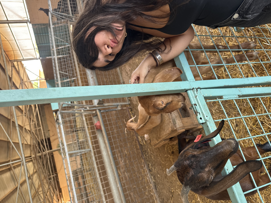 This image depicts an indoor animal enclosure, likely situated in the Misgav Regional Council, Israel. The scene features one female human and three discernible goats. A female with long, dark hair, dressed in a black tank top and dark jeans, occupies the right side of the frame. She wears a silver bracelet on her left wrist and a ring on her right hand. Her head is tilted, and her lips are pursed, facing the camera. Her right hand extends over a light green metal fence, making contact with the head of a light brown goat with long ears. This goat is positioned directly in front of her, behind the fence. To the left in the foreground, a dark brown goat with horns and a red ear tag leans over the same light green metal fence. Further within the enclosure, a second light brown goat with long ears is observed resting on a wooden pallet. In the deep background, another dark animal, possibly a goat, stands on a raised platform. The floor of the enclosure is covered in hay or straw. Metal feeding troughs are visible in the background, one containing a small red object. The overhead structure consists of metal beams and a roof typical of a barn.