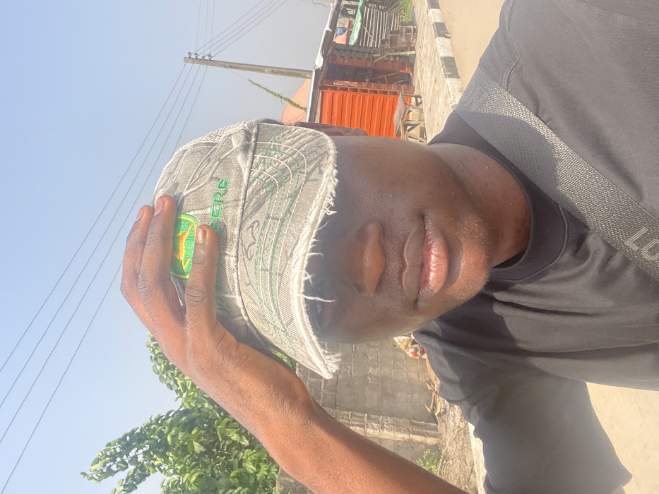 A man poses for a selfie, wearing a grey John Deere baseball cap. His hand touches the brim, obscuring his eyes. He has dark skin, full lips, and a black t-shirt with a grey strap across his shoulder. In the background are power lines, a building with orange metal and a grey cement wall, and green foliage. The photo is taken outdoors in sunlight.