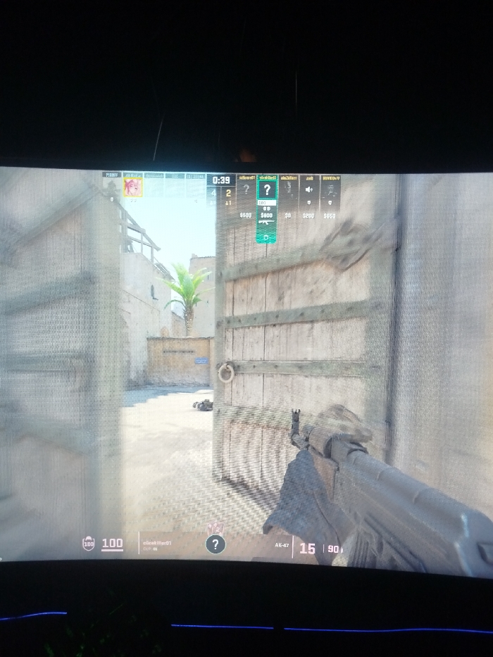The image displays a digital screen, likely a monitor, showing a first-person perspective from a tactical video game. The environment depicted within the game is a virtual desert setting featuring Middle Eastern-style architecture, including sand-colored stucco buildings and weathered wooden doors, and is not a real-world location in Balykchi, Uzbekistan. The foreground shows an open area beyond two large, partially open wooden doors with metal bands and a ring handle on the right door. A palm tree is visible in the background against a bright sky. A small, dark object rests on the ground near the left door. In the lower right quadrant, a player character's right arm, covered in a textured, possibly camouflage, sleeve, holds an AK-47 assault rifle, pointed forward. The rifle's front sight is clearly visible. Overlaying the game environment are user interface elements: * A timer "0:39" is centered at the top. * Player statistics "4 | 2" and an avatar for "PERBUFF" are at the top left. * Other player statuses and scores, including a highlighted green box with "101" and "$5000," are displayed at the top right. * The bottom left shows "100" next to a shield icon, indicating health or armor, and the player name "clicKilleR01". * The bottom right displays the weapon "AK-47" with ammunition counts "15 | 90." The photograph captures a screen door effect, indicating the pixel grid of the display. The physical bezel of the monitor, dark in color, frames the top and bottom of the active display area, with a faint blue light visible at the very bottom edge.