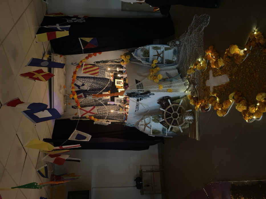 This image depicts an indoor scene in Veracruz City, Mexico, featuring a Day of the Dead altar with a prominent nautical theme