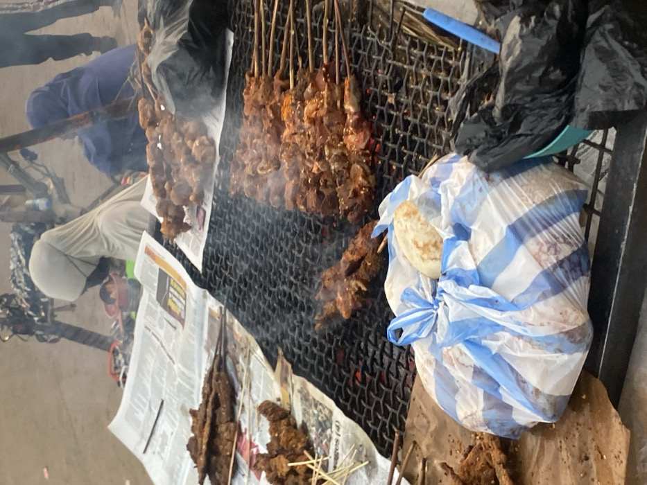 A grill laden with skewered meat, some emitting smoke, dominates the scene. The skewers are arranged haphazardly across the black grill. Beneath the grill, newspaper is spread out. Next to the grill, a plastic bag filled with what appears to be bread sits alongside a black plastic bag containing a blue bowl. Two individuals are partially visible in the background.