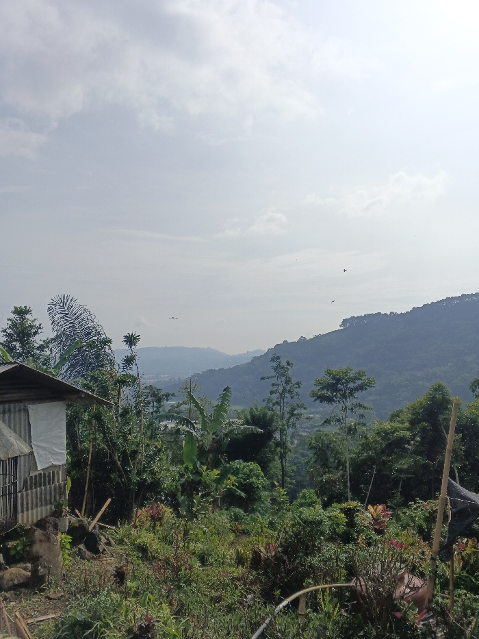 A lush, green hillside dominates the scene, partially obscured by dense vegetation and trees. In the foreground, a small, weathered structure with corrugated metal and a white cloth covering juts out. Scattered birds fly across the sky near a distant mountain range. The overall tone is peaceful and natural, with a hint of rural life.